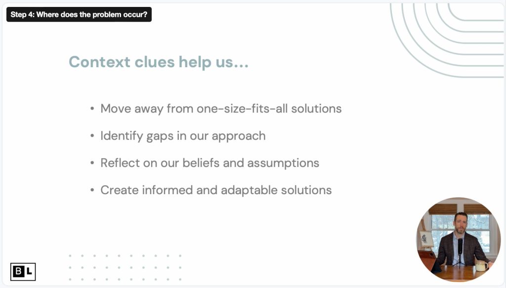 Complex problems don’t exist in isolation—they are deeply shaped by their environments. Current events, conditions, and stakeholder perspectives influence both the problem itself and the solutions available. That’s why analyzing where the problem manifests is critical. I’ll guide you through a context survey to uncover these key influences.