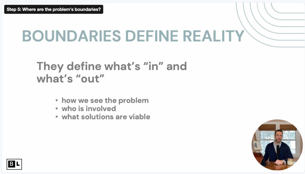 Clarify the boundaries of the problem—defining what’s in and out of scope. This is key for knowing where your influence can make a difference and where the problem ends.